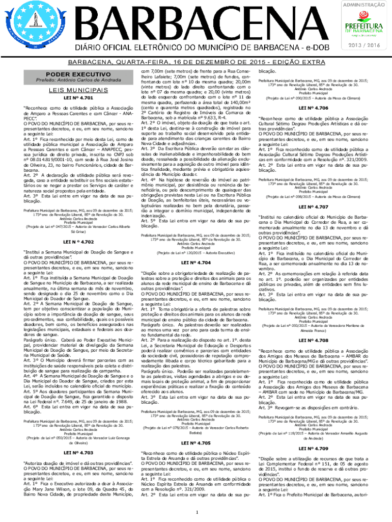 BARBACENA, QUARTAFEIRA, 16 DE DEZEMBRO DE 2015 EDIO EXTRA PODER EXECUTIVOPrefeito: Antnio Carlos de AndradaLEIS MUNICIPAIS LEI N 4.701 Reconhece como de utilidade pblica a Associao de Amparo a Pessoas