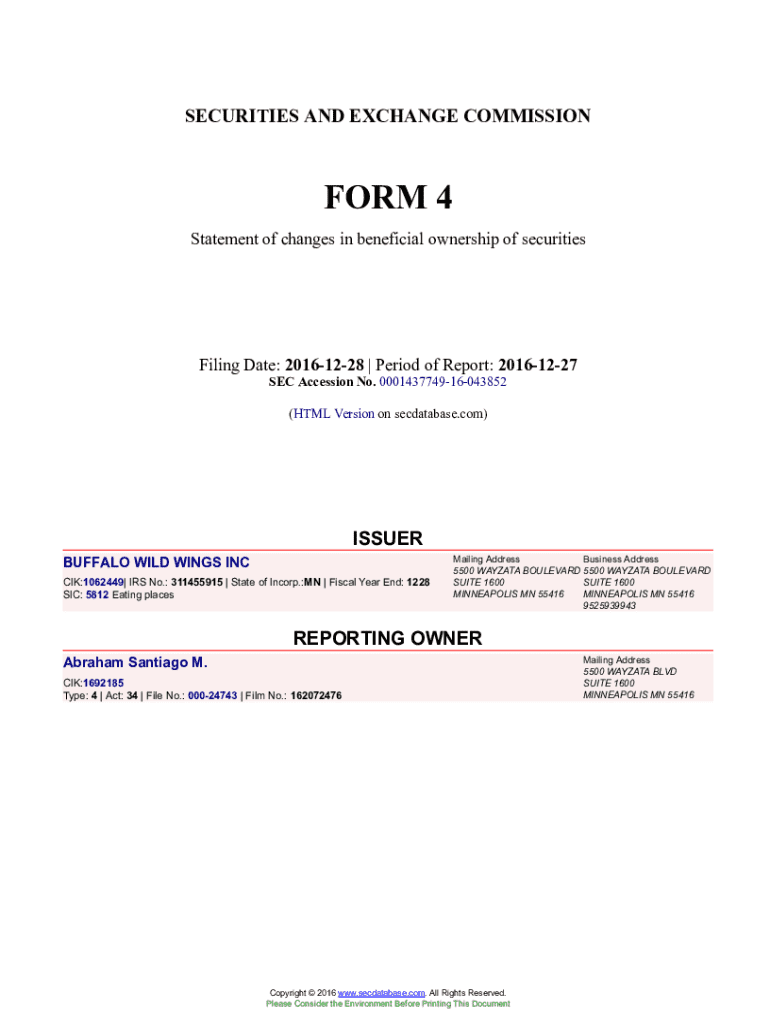 Get the free BUFFALO WILD WINGS INC Form 4 Filed 2016-12-28. Accession Number