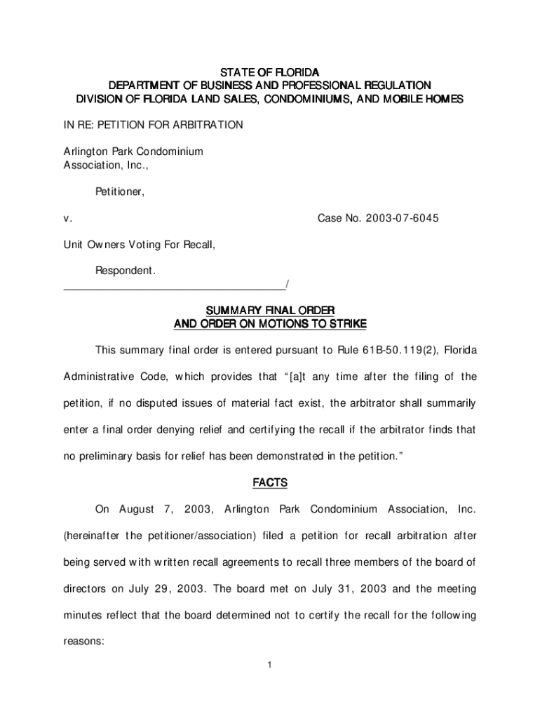 STATE OF FLORIDA DEPARTMENT OF BUSINESS AND PROFESSIONAL REGULATION DIVISION OF FLORIDA LAND SALES, CONDOMINIUMS, AND MOBILE HOMES IN RE: PETITION FOR ARBITRATION Arlington Park Condominium Association,