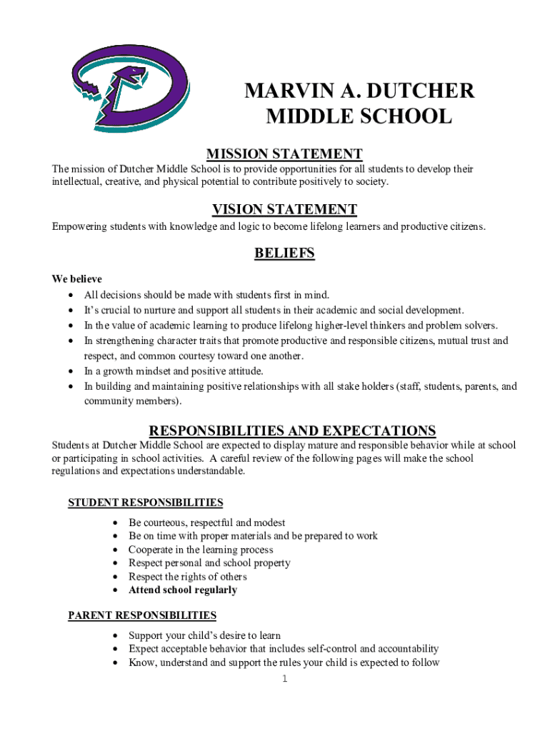 MARVIN A. DUTCHER MIDDLE SCHOOL MISSION STATEMENTThe mission of Dutcher Middle School is to provide opportunities for all students to develop their intellectual, creative, and physical potential to