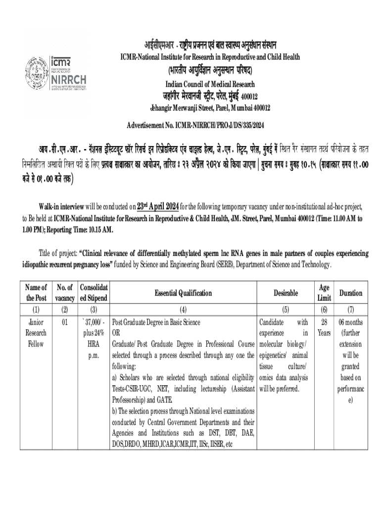 Advertisement No. ICMRNIRRCH/PROJ./DS/335/2024Aaya.saI