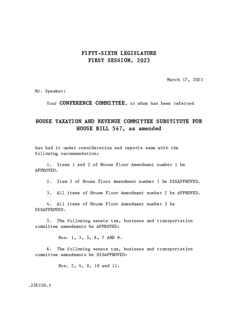 FIFTYSIXTH LEGISLATURE FIRST SESSION, 2023 March 17, 2023 Mr. Speaker: YourCONFERENCE COMMITTEE,to whom has been referredHOUSE TAXATION AND REVENUE COMMITTEE SUBSTITUTE FOR HOUSE BILL 547, as amended
