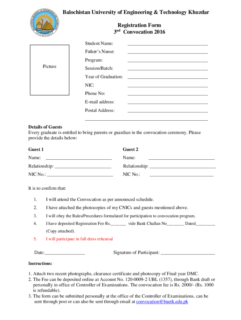 Balochistan University of Engineering & Technology Khuzdar Registration Form 3 Convocation 2016 ndPictureStudent Name:___Fathers Name:___Program:___Session/Batch:___Year of Graduation: ___ NIC:___Phone