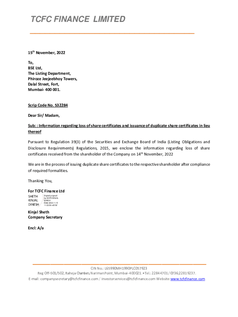 Entities and individuals engaging with TCFC Finance Limited for financial services or products are typically required to file relevant documentation as per regulatory compliance.