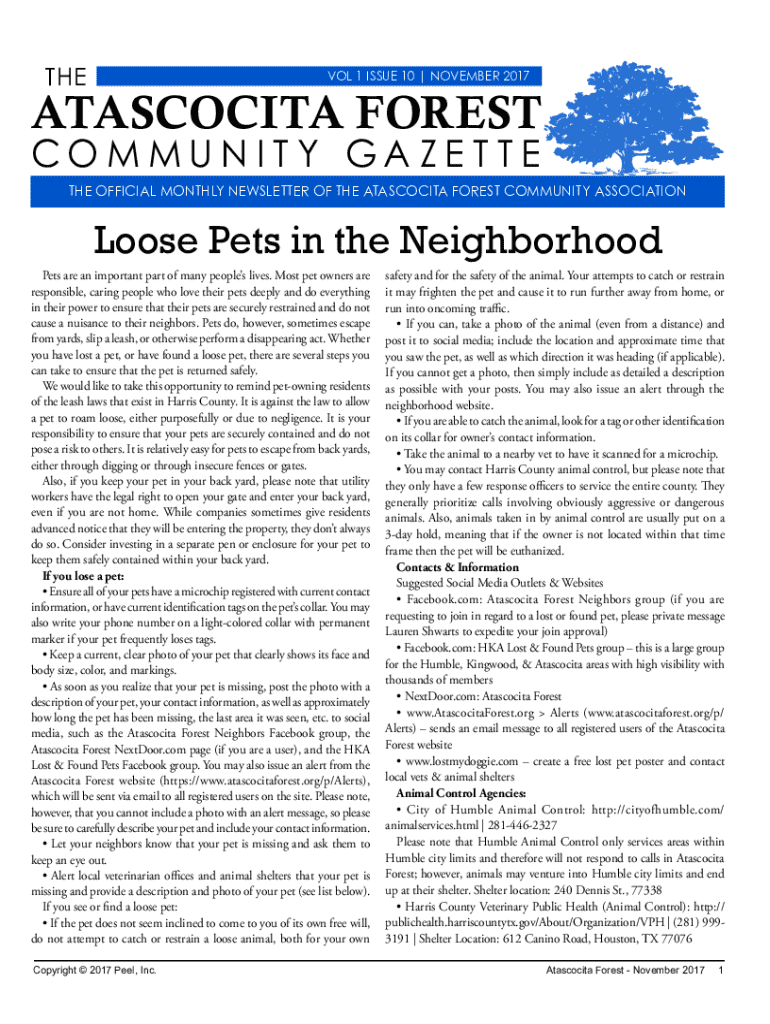 COMMUNITY Y GA HE T TETHER OFFICIAL MONTHLY NEWSLETTER OF THE ATASCOCITA FOREST COMMUNITY ASSOCIATIONLoose Pets in the Neighborhood