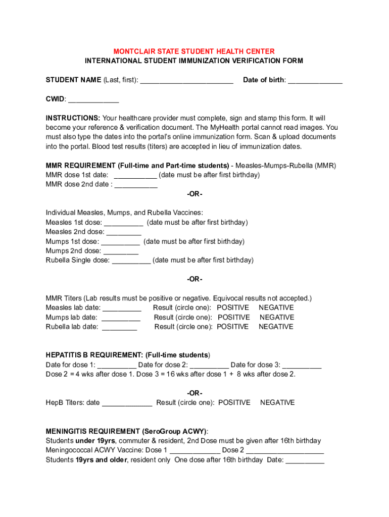 MONTCLAIR STATE STUDENT HEALTH CENTER INTERNATIONAL STUDENT IMMUNIZATION VERIFICATION FORM STUDENT NAME (Last, first): ___Date of birth: ___CID: ___ INSTRUCTIONS: Your healthcare provider must complete,