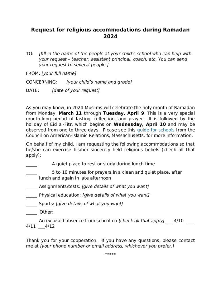 Template Ramadan Religious Accommodation Request Template (K ... instructions