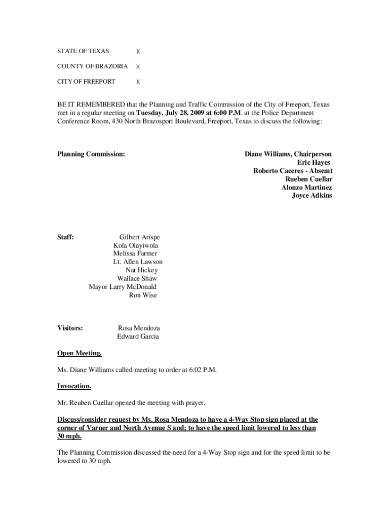 STATE OF TEXAS)(COUNTY OF BRAZIL)(CITY OF FREEPORT)(BE IT REMEMBERED that the Planning and Traffic Commission of the City of Freeport, Texas