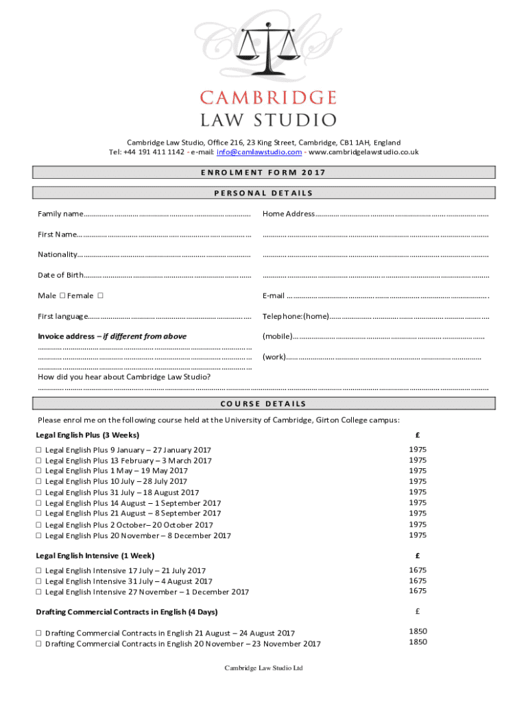 Cambridge Law Studio, Office 216, 23 King Street, Cambridge, CB1 1AH, England Tel: +44 191 411 1142 email: info@camlawstudio.com www.cambridgelawstudio.co.ukENROLMENT FORM 2017 PERSONAL DETAILS Family