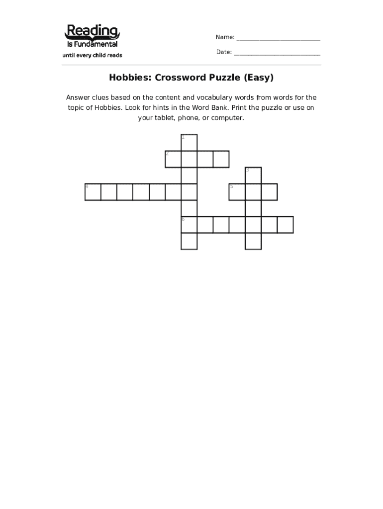 Name: ___ Date: ___Hobbies: Crossword Puzzle (Easy) Answer clues based on the content and vocabulary words from words for the topic of Hobbies. Look for hints in the Word Bank. Print the puzzle or