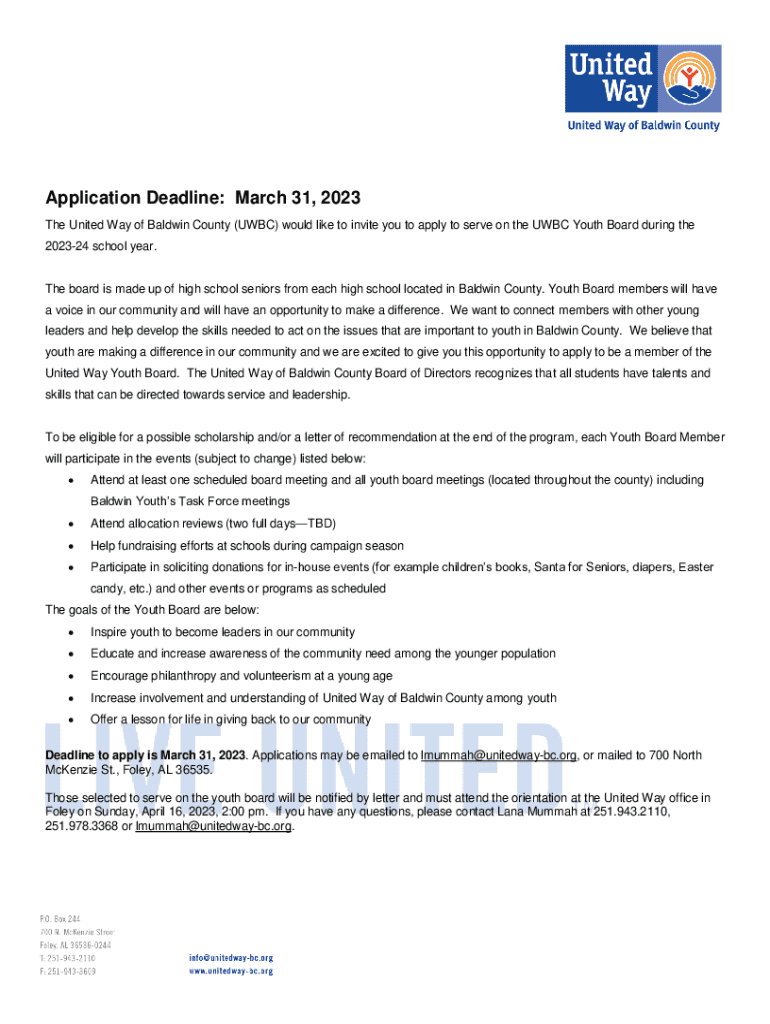 The United Way of Baldwin County (UBC) would like to invite you to apply to serve on the UBC Youth Board during the