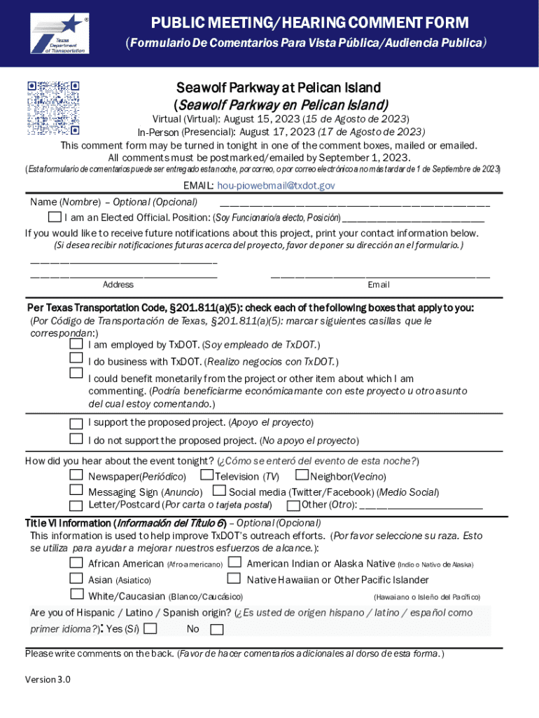 PUBLIC MEETING/HEARING COMMENT FORM(Formulario De Comentarios Para Vista Pblica/Audiencia Publica)