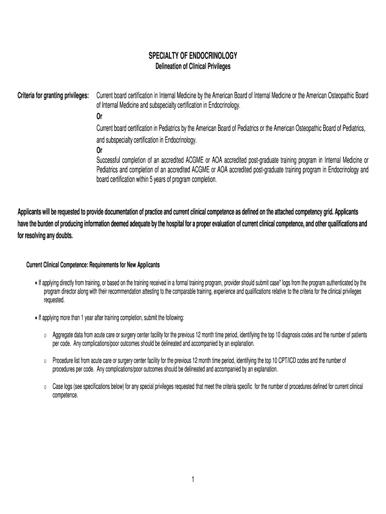 SPECIALTY OF ENDOCRINOLOGY Delineation of Clinical Privileges Criteria for granting privileges: Current board certification in Internal Medicine by the American Board of Internal Medicine or the American