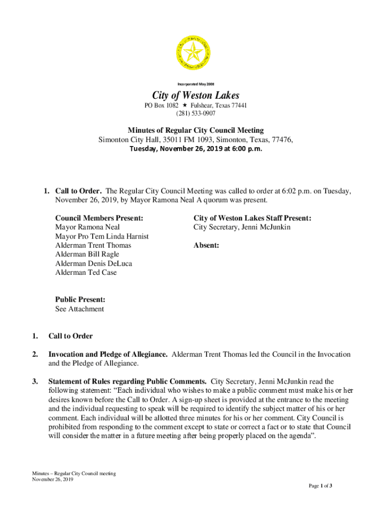 Get the free November 26, 2019, by Mayor Ramona Neal A quorum was present