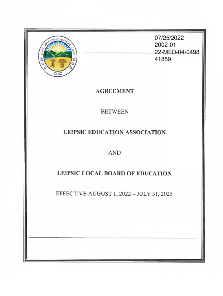 41859AGREEMENTBETWEENLEIPSIC EDUCATION ASSOCIATIONANDLEIPSIC LOCAL BOARD OF EDUCATIONEFFECTIVE AUGUST 1, 2022, JULY 31, 2025TABLE OF CONTENTS