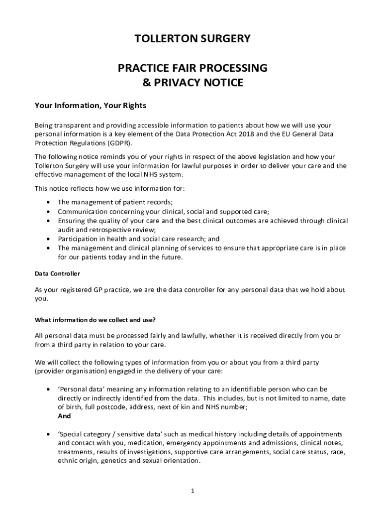 TOLLERTON SURGERY PRACTICE FAIR PROCESSING & PRIVACY NOTICE Your Information, Your Rights Being transparent and providing accessible information to patients about how we will use your personal information