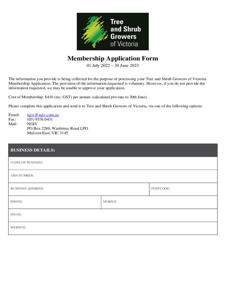 Membership Application Form 01 July 2022 30 June 2023 The information you provide is being collected for the purpose of processing your Tree and Shrub Growers of Victoria Membership Application. The