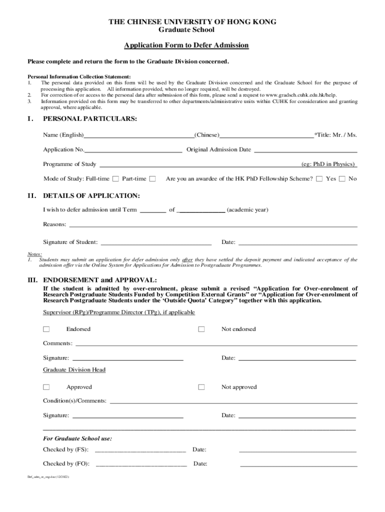 THE CHINESE UNIVERSITY OF HONG KONG Graduate School Application Form to Defer Admission Please complete and return the form to the Graduate Division concerned. Personal Information Collection Statement: