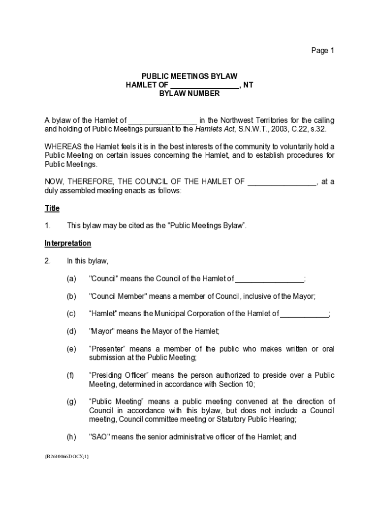 Page 1 PUBLIC MEETINGS BYLAW HAMLET OF ___, NT BYLAW NUMBER A bylaw of the Hamlet of ___ in the Northwest Territories for the calling and holding of Public Meetings pursuant to the Hamlets Act, S.N.W.T.,