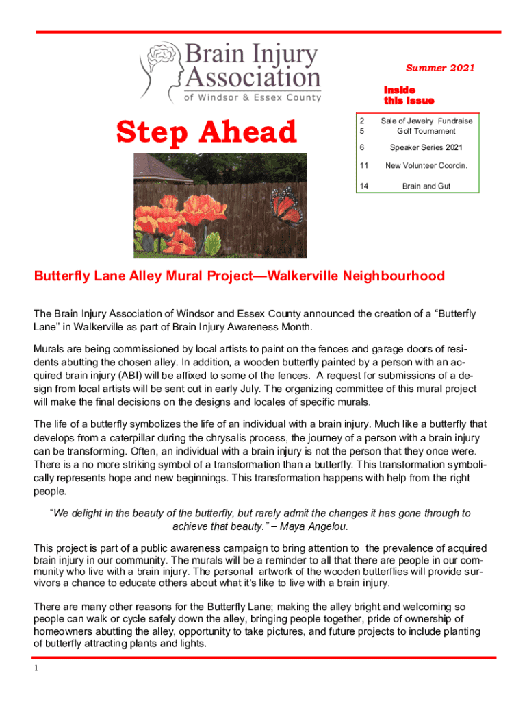 Summer 2021 Inside this IssueStep Ahead2 5Sale of Jewelry Fundraise Golf Tournament6Speaker Series 202111New Volunteer Coordin.14Brain and GutButterfly Lane Alley Mural ProjectWalkerville Neighbourhood