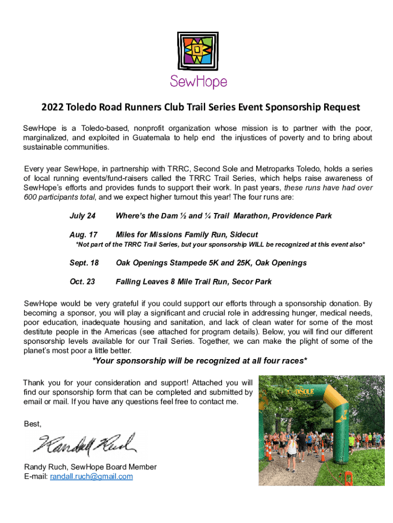 2022 Toledo Road Runners Club Trail Series Event Sponsorship Request SewHope is a Toledobased, nonprofit organization whose mission is to partner with the poor, marginalized, and exploited in Guatemala