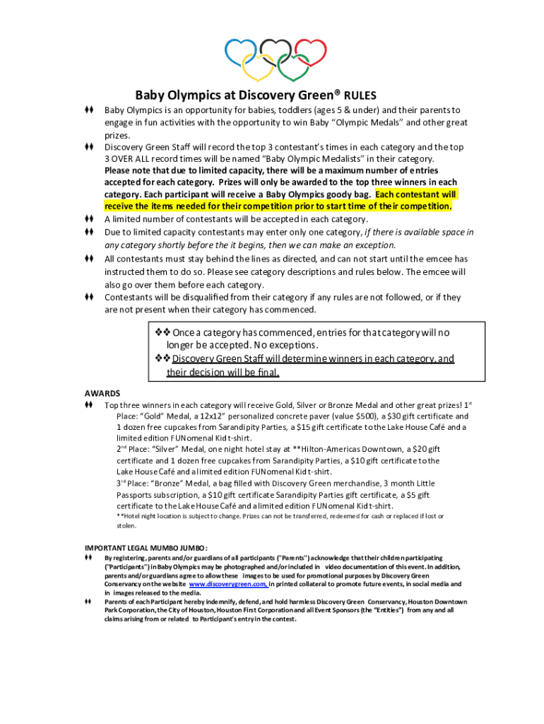 BabyOlympicsatDiscoveryGreenRULES uuuuuu uu uuuuBabyOlympicsisanopportunityforbabies,toddlers(ages5&under)andtheirparentsto engageinfunactivitieswiththeopportunitytowinBabyOlympicMedalsandothergreat