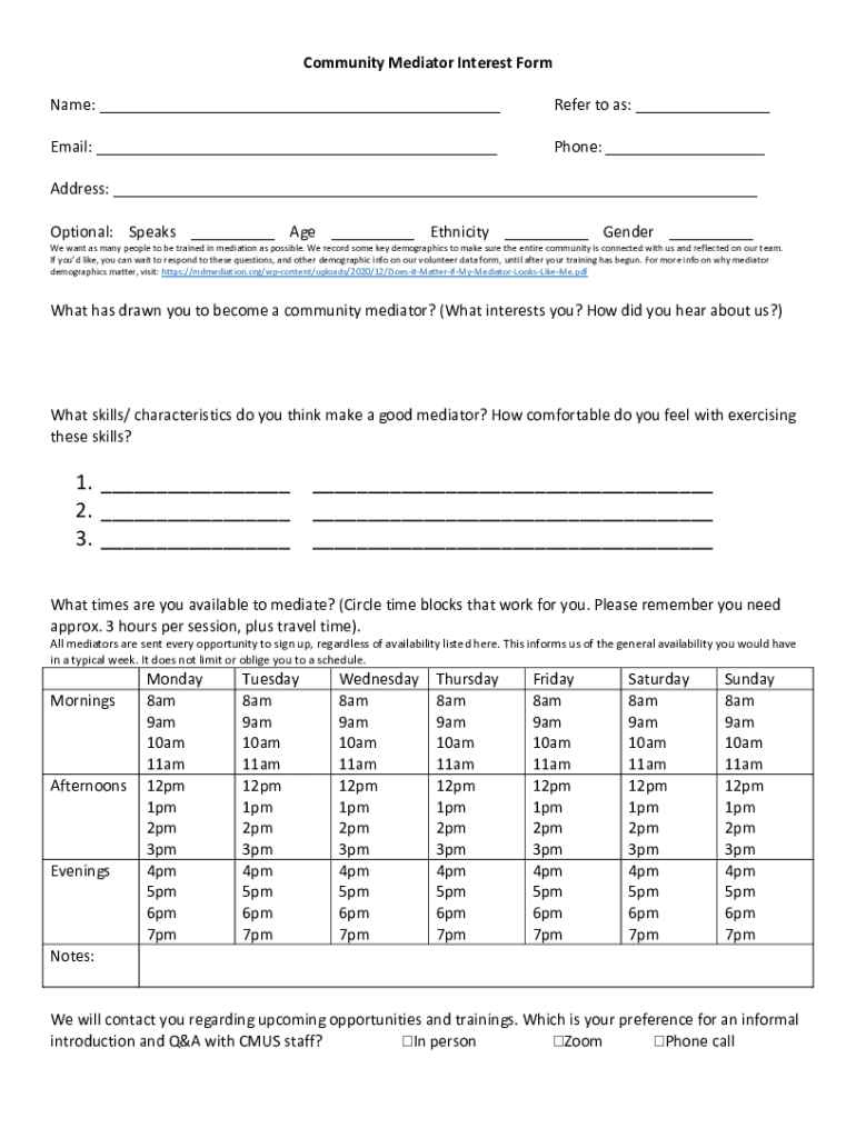 Community Mediator Interest Form Name: ___Refer to as: ___Email: ___Phone: ___Address: ___ Optional: Speaks ___ Age ___ Ethnicity ___ Gender ___We want as many people to be trained in mediation as