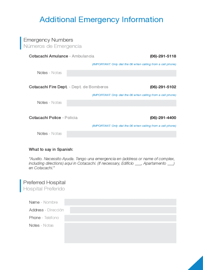 Additional Emergency Information Emergency Numbers Nmeros de Emergencia Cotacachi Amulance Ambulancia(06)2915118(IMPORTANT: Only dial the 06 when calling from a cell phone)Notes Notas Cotacachi Fire