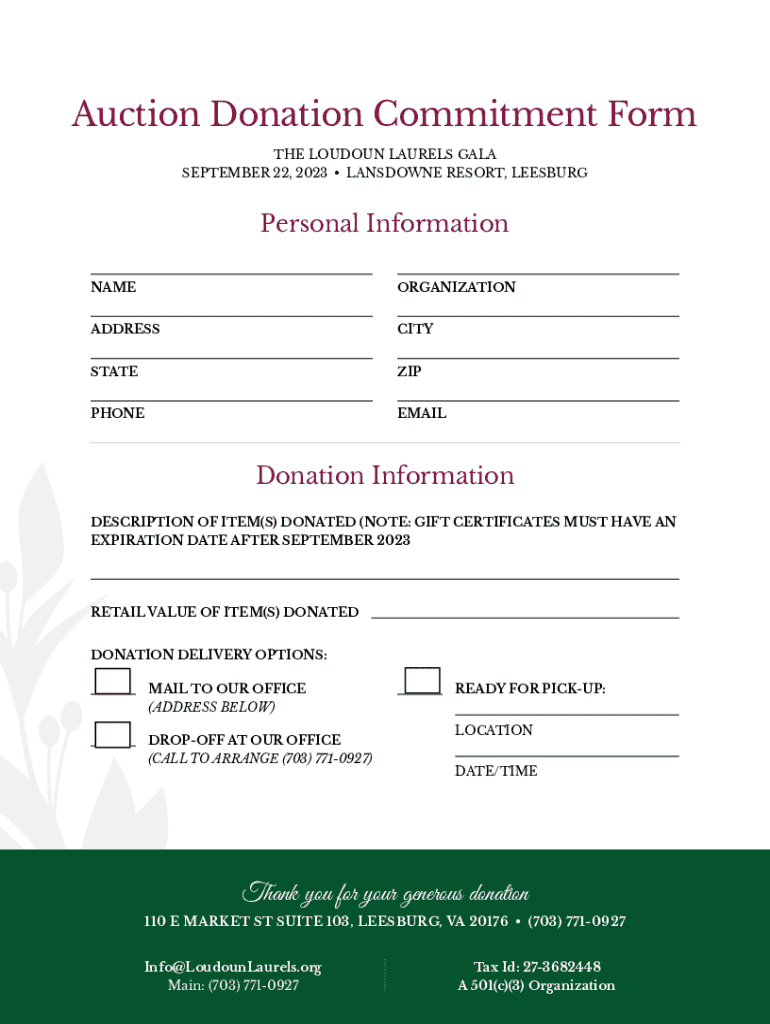Auction Donation Commitment Form THE LOUDOUN LAURELS GALA SEPTEMBER 22, 2023 LANSDOWNE RESORT, LEESBURGPersonal Information NAMEORGANIZATIONADDRESSCITYSTATEZIPPHONEEMAILDonation Information DESCRIPTION