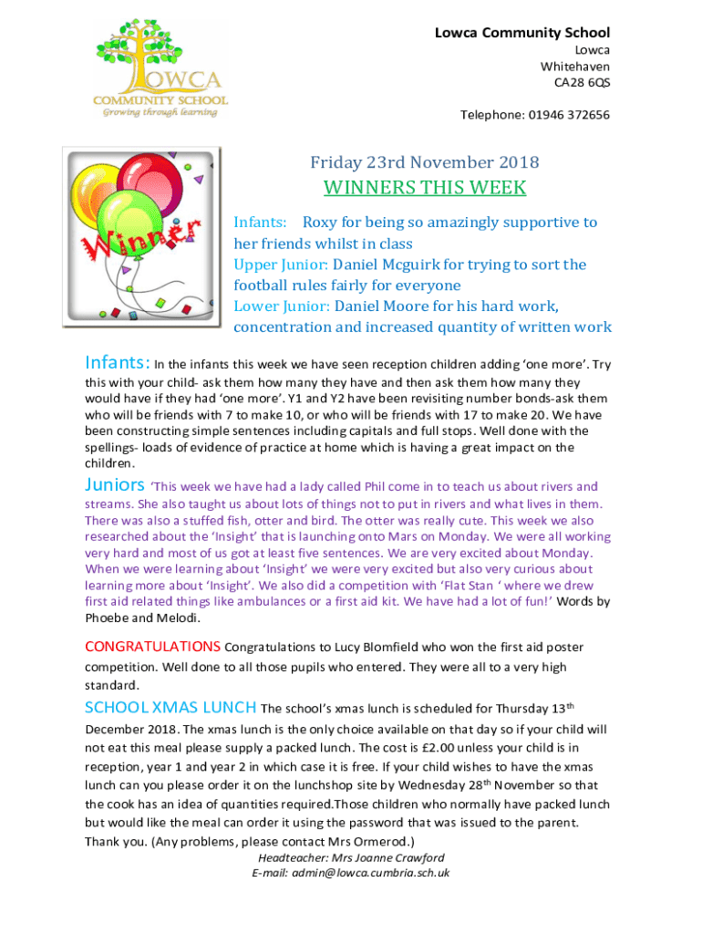 Lowca Community School Lowca Whitehaven CA28 6QS Telephone: 01946 372656Friday 23rd November 2018WINNERS THIS WEEK Infants: Roxy for being so amazingly supportive to her friends whilst in class Upper