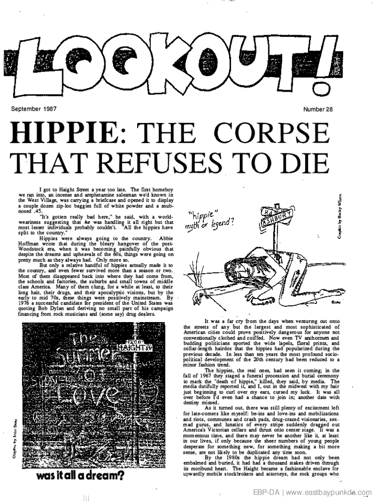 September 1987Number 28HIPPIE: THE CORPSE THAT REFUSES TO DIE I got to Haight Street a year too late. The first homeboy we ran into, an incense and amphetamine salesman we\'d known in the West Village,