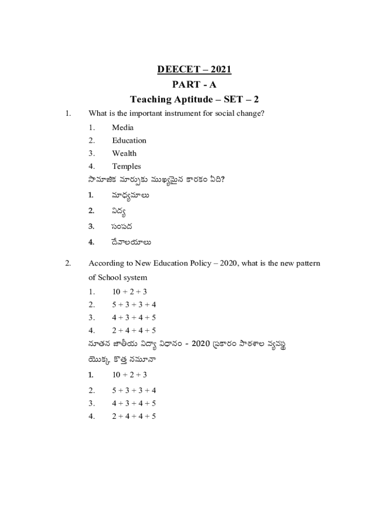 DEECET 2021 PART A Teaching Aptitude SET 2 1.What is the important instrument for social change? 1.Media2.Education3.Wealth4.Templeske esT eTTKyTq s+ @? 1. e eT 2. $ 3. d+| 4. yjT 2.According to New