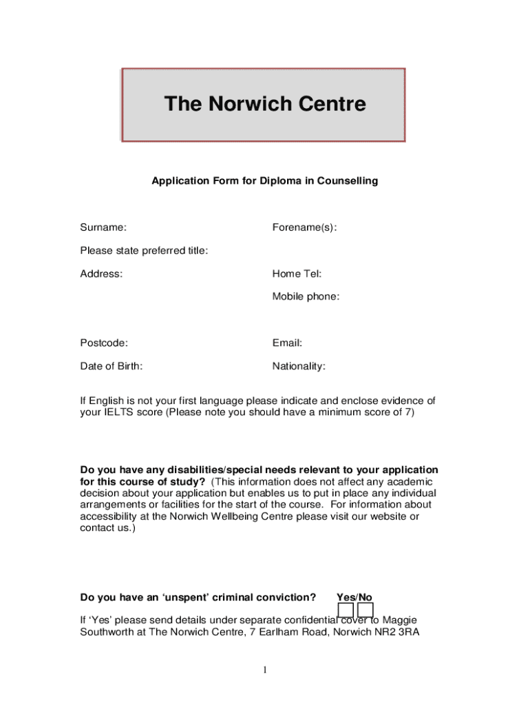 The Norwich CentreApplication Form for Diploma in CounsellingSurname:Forename(s):Please state preferred title: Home Tel:Address:Mobile phone:Postcode:Email:Date of Birth:Nationality:If English is