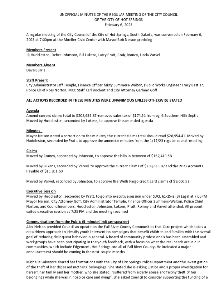 UNOFFICIAL MINUTES OF THE REGULAR MEETING OF THE CITY COUNCIL OF THE CITY OF HOT SPRINGS February 6, 2023 A regular meeting of the City Council of the City of Hot Springs, South Dakota, was convened