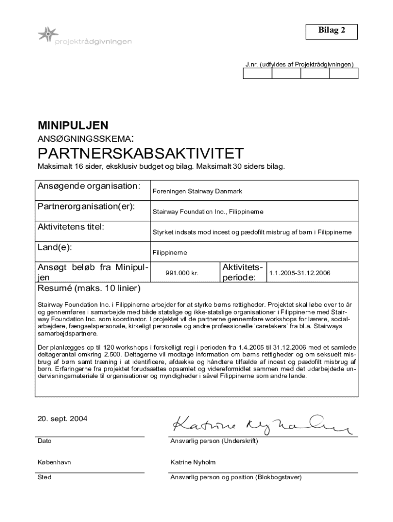 Bilag 2J.nr. (udfyldes af Projektrdgivningen)MINIPULJEN ANSGNINGSSKEMA:PARTNERSKABSAKTIVITET Maksimalt 16 sider, eksklusiv budget og bilag. Maksimalt 30 siders bilag.Ansgende organisation: Partnerorganisation(er):