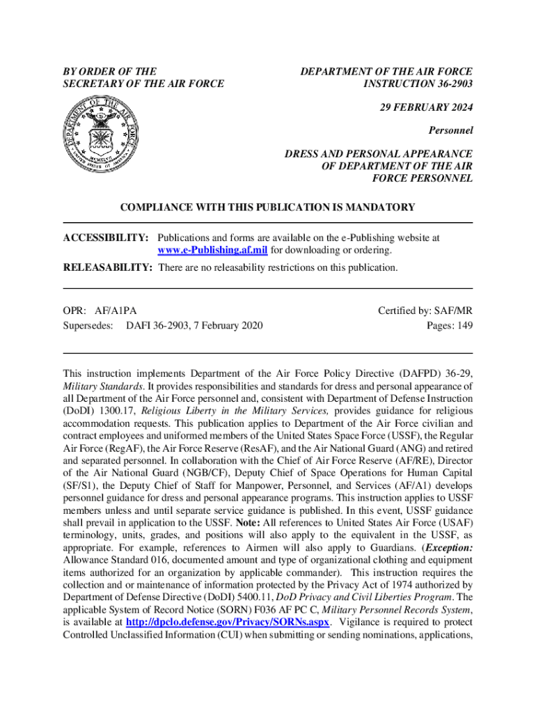 BY ORDER OF THE SECRETARY OF THE AIR FORCEDEPARTMENT OF THE AIR FORCE INSTRUCTION 362903 29 FEBRUARY 2024 Personnel DRESS AND PERSONAL APPEARANCE OF DEPARTMENT OF THE AIR FORCE PERSONNELCOMPLIANCE