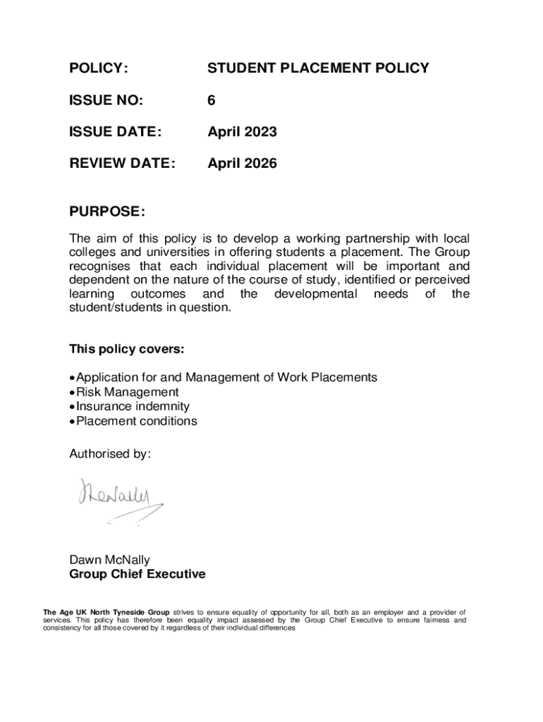 POLICY:STUDENT PLACEMENT POLICYISSUE NO:6ISSUE DATE:April 2023REVIEW DATE:April 2026PURPOSE: