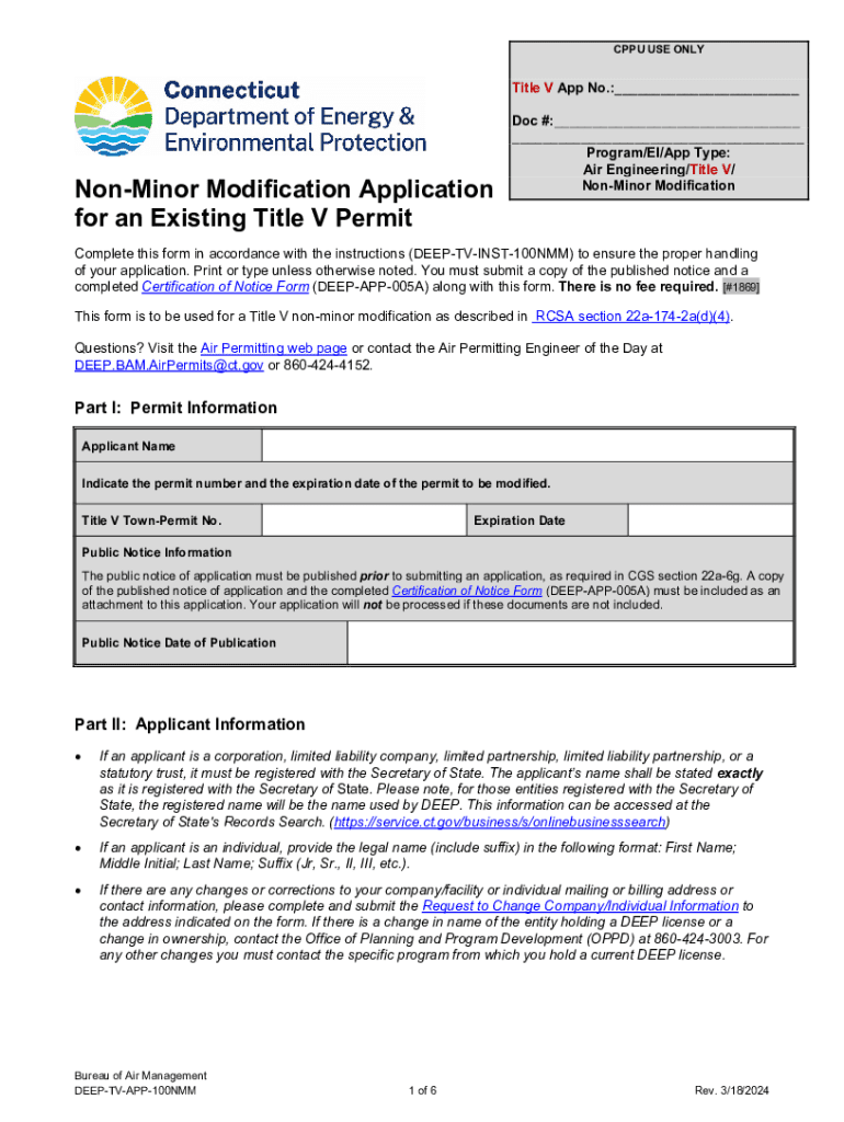 CPPU USE ONLYTitle V App No.:___NonMinor Modification Application for an Existing Title V PermitDoc #:___ ___ Program/EI/App Type: Air Engineering/Title V/ NonMinor ModificationComplete this form