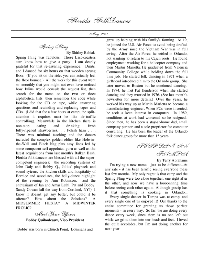 Florida Folksinger May, 2001Spring Fling By Shirley Babies Spring Fling was fabulous. Those East coasters sure know how to give a party! I am deeply grateful for that reassuring experience. Dmitri