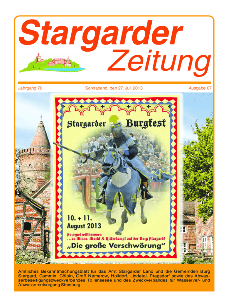 StargarderZeitungJahrgang 76Sonnabend, den 27. Juli 2013Ausgabe 07Amtliches Bekanntmachungsblatt fr das Amt Stargarder Land und die Gemeinden Burg Stargard, Cammin, Clpin, Gro Nemerow, Holldorf, Lindetal,