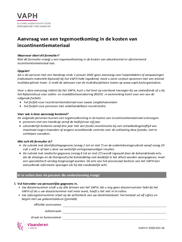 Aanvraag van een tegemoetkoming in de kosten van incontinentiemateriaal Waarvoor dient dit formulier? Met dit formulier vraagt u een tegemoetkoming in de kosten van absorberend en afschermend incontinentiemateriaal