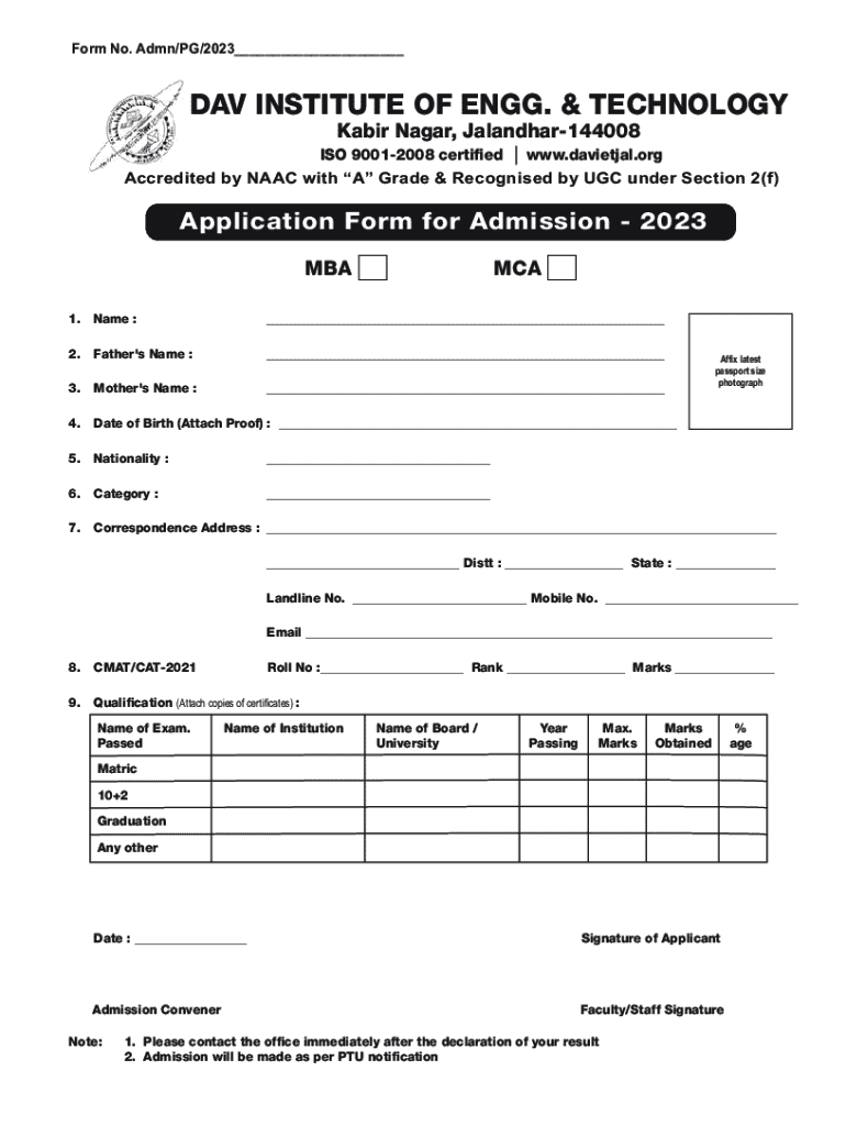 Form No. Admn/PG/2023___DAV INSTITUTE OF ENGG. & TECHNOLOGY Kabir Nagar, Jalandhar144008 ISO 90012008 certi ed www.davietjal.org Accredited by NAAC with A Grade & Recognised by UGC under Section 2(f)Application