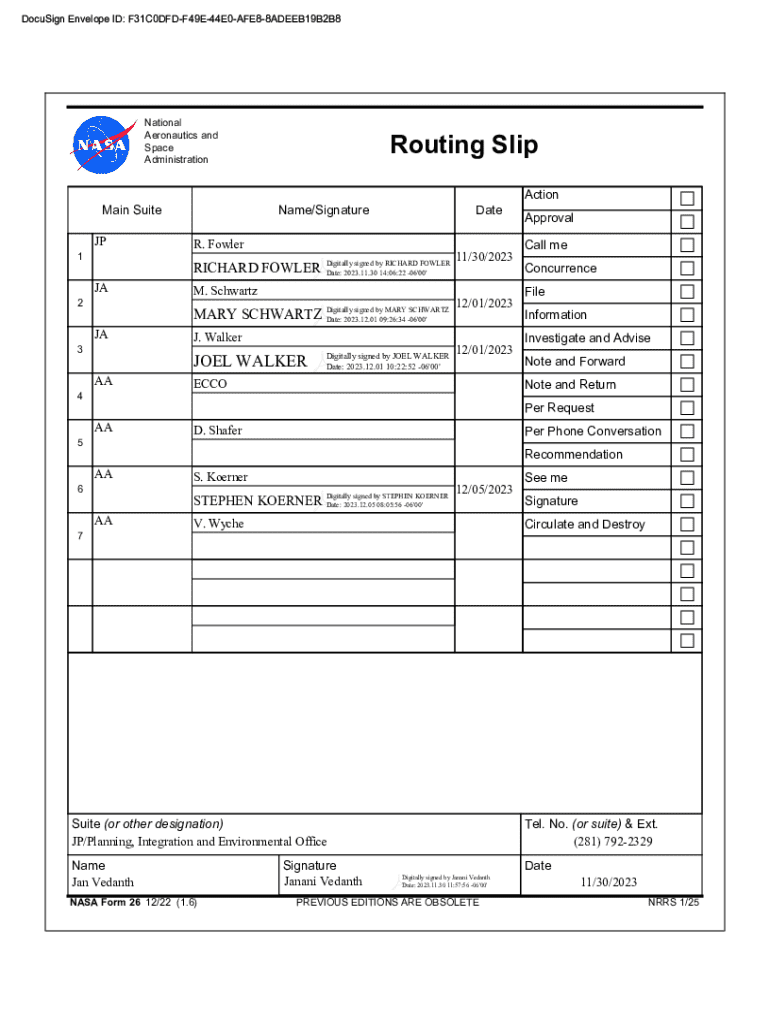 DocuSign Envelope ID: F31C0DFDF49E44E0AFE88ADEEB19B2B8National Aeronautics and Space AdministrationRouting Slip ActionMain Suite JP 1Name/Signature R. FowlerRICHARD FOWLER JA2JA AADigitally signed