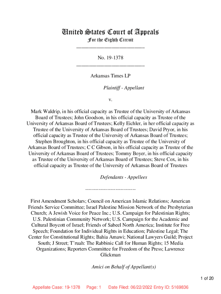 United States Court of Appeals For the Eighth Circuit ___ No. 191378 ___ Arkansas Times LP Plaintiff Appellant v. Mark Waldrip, in his official capacity as Trustee of the University of Arkansas Board