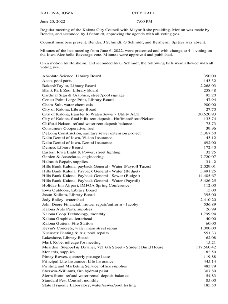 KALONA, IOWA June 20, 2022CITY HALL 7:00 PMRegular meeting of the Kalona City Council with Mayor Robe presiding. Motion was made by Bender, and seconded by J Schmidt, approving the agenda with all