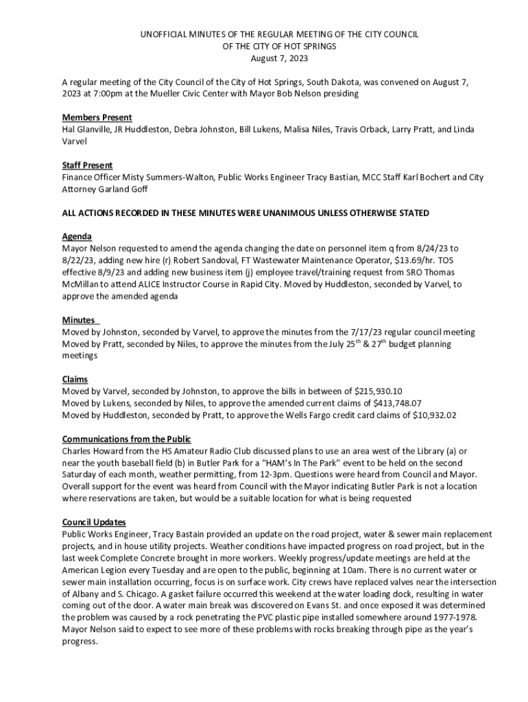 UNOFFICIAL MINUTES OF THE REGULAR MEETING OF THE CITY COUNCIL OF THE CITY OF HOT SPRINGS August 7, 2023 A regular meeting of the City Council of the City of Hot Springs, South Dakota, was convened
