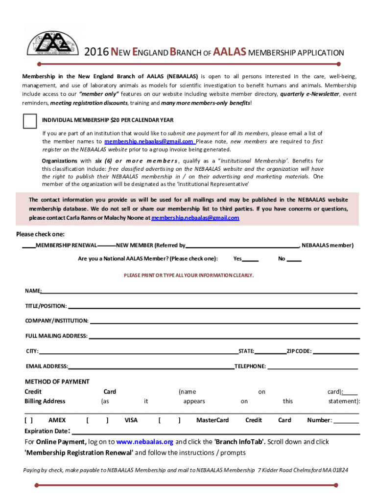 2016 NEW ENGLAND BRANCH OF ATLAS MEMBERSHIP APPLICATION Membership in the New England Branch of ATLAS (NEBULAS) is open to all persons interested in the care, wellbeing, management, and use of laboratory