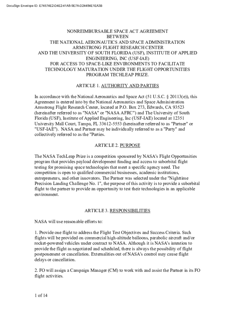 DocuSign Envelope ID: E74574E2D4E241A89E7AD24484E1EA3BNONREIMBURSABLE SPACE ACT AGREEMENT