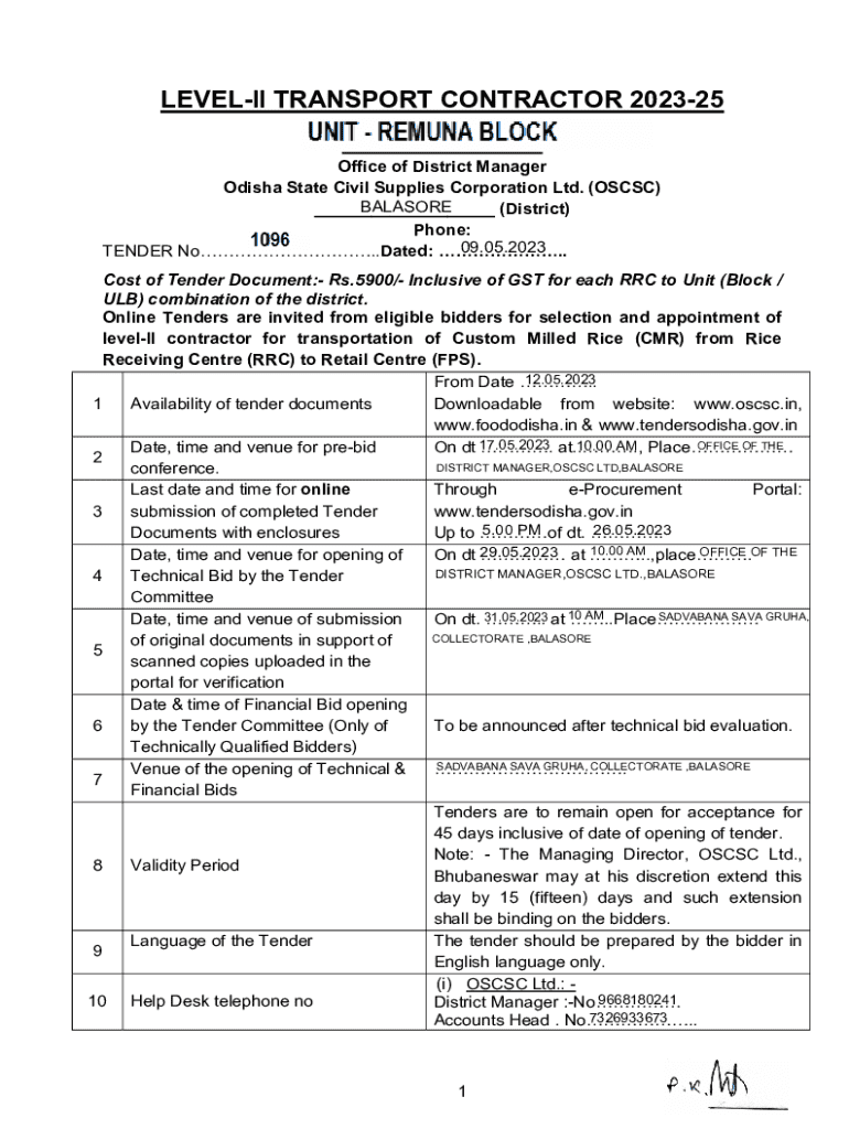 LEVELII TRANSPORT CONTRACTOR 202325 UNIT BALASORE MUNICIPALITY NOTICE INVITING TENDEROffice of District Manager Odisha State Civil Supplies Corporation Ltd. (OSCSC) BALASORE ___ (District) Phone: