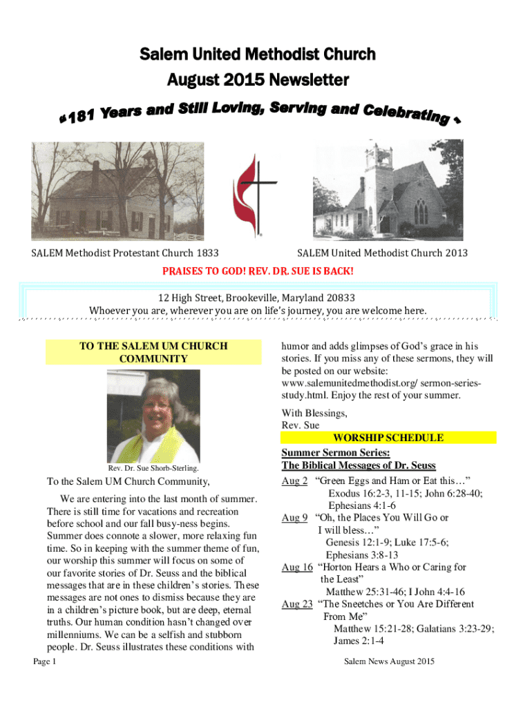 Salem United Methodist Church August 2015 NewsletterSALEM Methodist Protestant Church 1833SALEM United Methodist Church 2013PRAISES TO GOD! REV. DR. SUE IS BACK! 12 High Street, Brookeville, Maryland